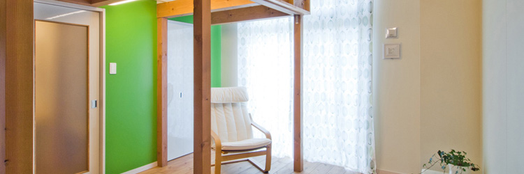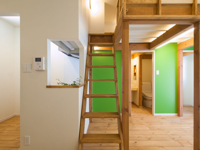 特徴は全面が真っさらな白い壁面とその対面にあたる階段側の明るいグリーンの壁。